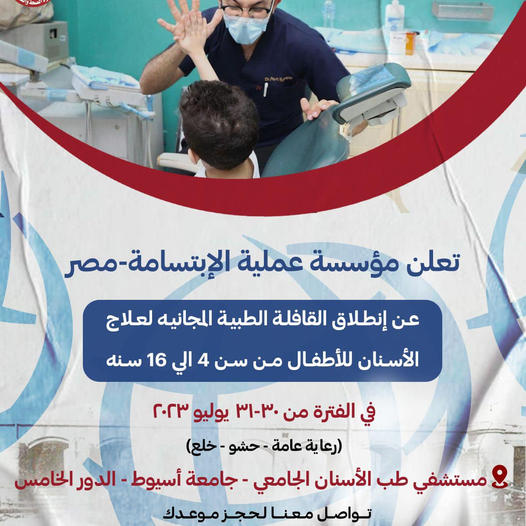 القافلة الطبية المجانيه لعلاج الأسنان للأطفال من سن ٤ الي ١٦ سنه في الفترة من ٣٠-٣١ يوليو ٢٠٢٣
