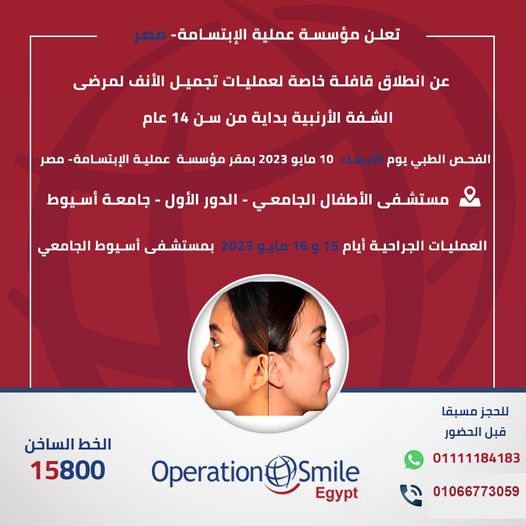 انطلاق قافلة خاصة لعمليات تجميل الأنف لمرضى الشفة الأرنبية بداية من سن ١٤ عام.
