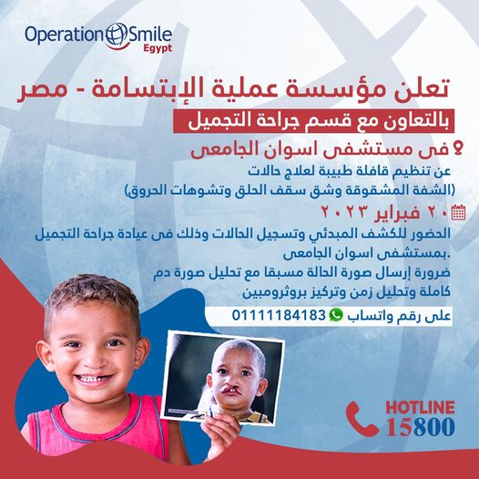 تعلن مؤسسة عملية الإبتسامة-مصر بالتعاون مع مستشفي أسوان الجامعى عن تنظيم قافلة شهريا لعلاج حالات شق الشفه و شق سقف الحلق والحروق.