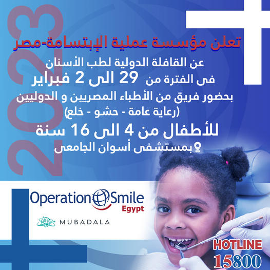 تعلن مؤسسة عملية الإبتسامة-مصر عن القافلة الدولية لطب الأسنان في الفترة من ٢٩ الي ٢ فبراير بحضور فريق من الأطباء المصرين و الدوليين (رعاية عامة – حشو -خلع)