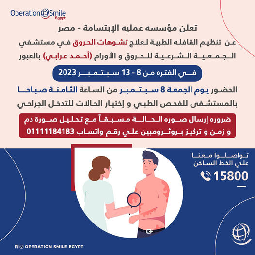 تعلن مؤسسه عمليه الإبتسامة-مصر عن تنظيم القافله الطبية لعلاج تشوهات الحروق بمستشفي الجمعية الشرعية للحروق و الأورام (أحمد عرابي) بالعبور في الفتره من ٨ – ١٣ سبتمبر ٢٠٢٣.